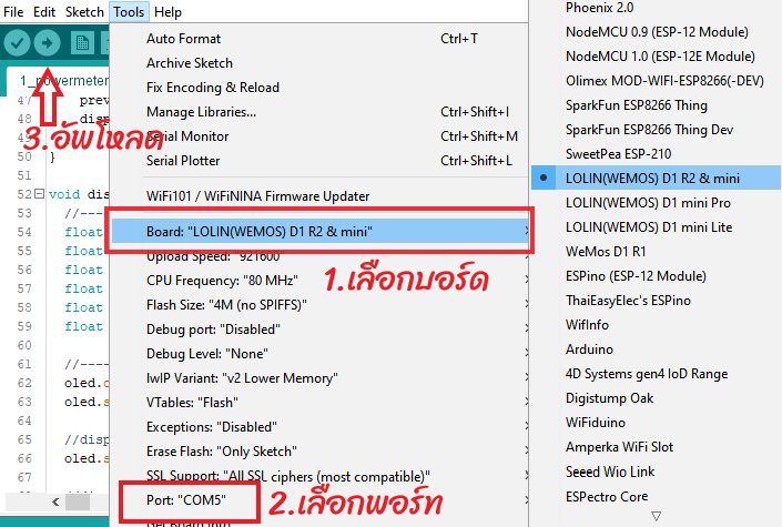 ESP8266 เมื่อจะอัปโหลดโค้ด ให้เลือกบอร์ดเป็น LOLIN(WEMOS) D1 R2 & mini